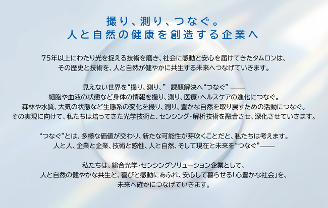 タムロン、2035年に向けた長期ビジョンを刷新「撮り、測り、つなぐ。人と自然の健康を創造する企業へ」~光学の力を社会課題解決へ接続し、「心豊かな社会」を未来につなぐ~