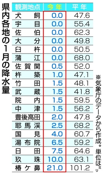 1月の大分県内、記録的な少雨に 6カ所で降水量ゼロ、全19地点で過去最少に