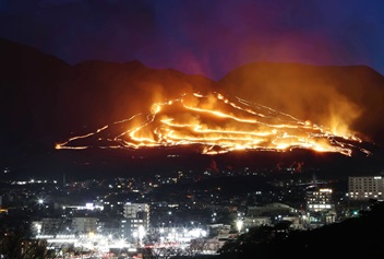 別府市で「扇山火まつり」 山肌を焦がす炎の帯、50回記念の花火も