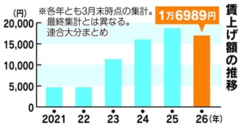 大分県内の平均賃上げ額1万6989円、高水準を維持 春闘第1回集計、3年連続5%超す