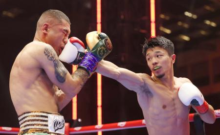 国際ボクシング連盟(IBF)フライ級タイトルマッチ12回戦は27日、愛知県国際展示場で行われ、チャンピオンの矢吹正道(緑)が挑戦者で同級1位のフェリックス・アルバラード(ニカラグア)に12回1分59秒KO勝ちし、初防衛した。
