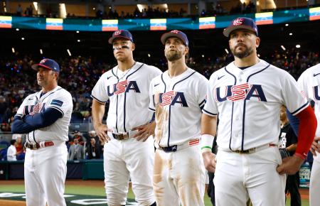 ▽捕手 ウェルズ(ドミニカ共和国)▽一塁手 アラエス(ベネズエラ)▽二塁手 チュラング(米国)▽三塁手 ガルシア(ベネズエラ)▽遊撃手 トーバー(ベネズエラ)▽外野手 アンソニー(米国)タティス(ドミニカ共和国)ノリ(イタリア)▽DH 大谷▽投手 スキーンズ、ウェブ(ともに米国)ノラ(イタリア)