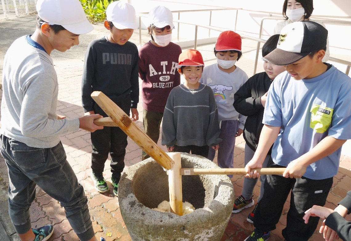 国東市安岐小で児童が餅つき体験石臼ときねで「ぺったん、ぺ...