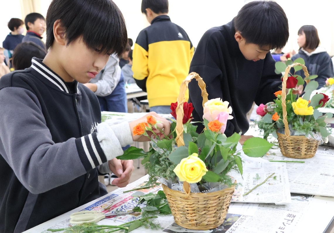 玖珠町の塚脇小児童がフラワーアレンジメントに挑戦体験を通...
