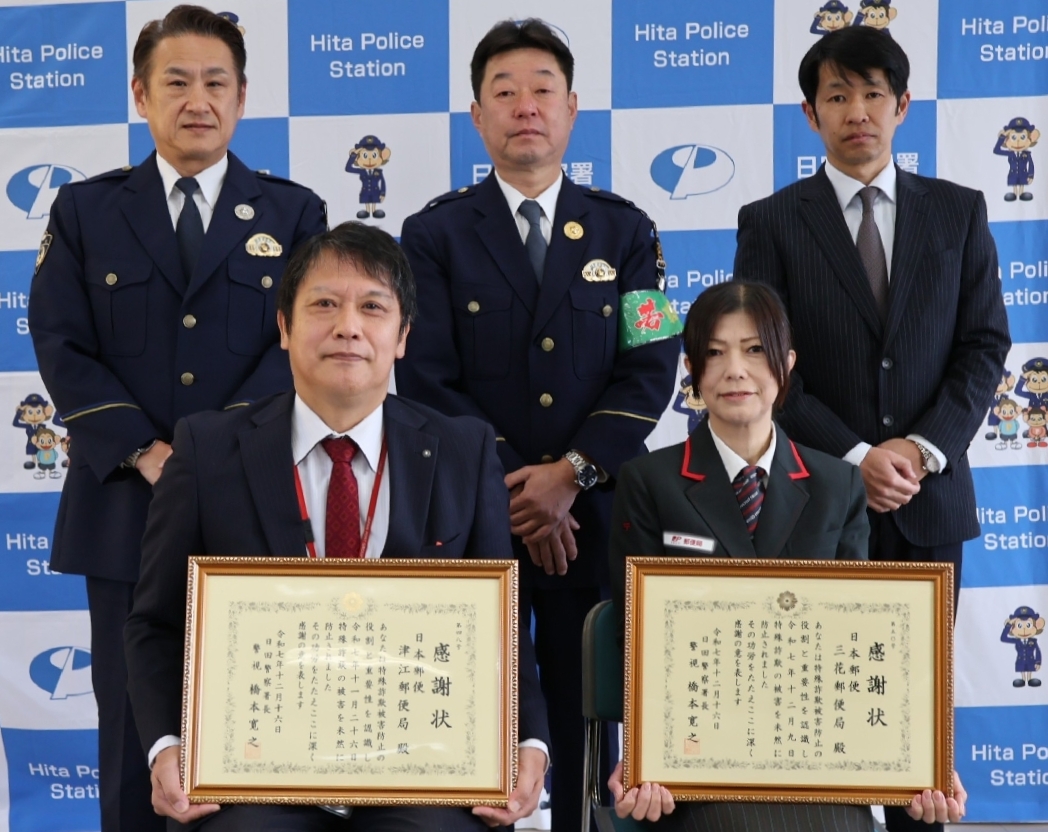 日田署が市内の2郵便局に感謝状局員が通報、特殊詐欺被害防...