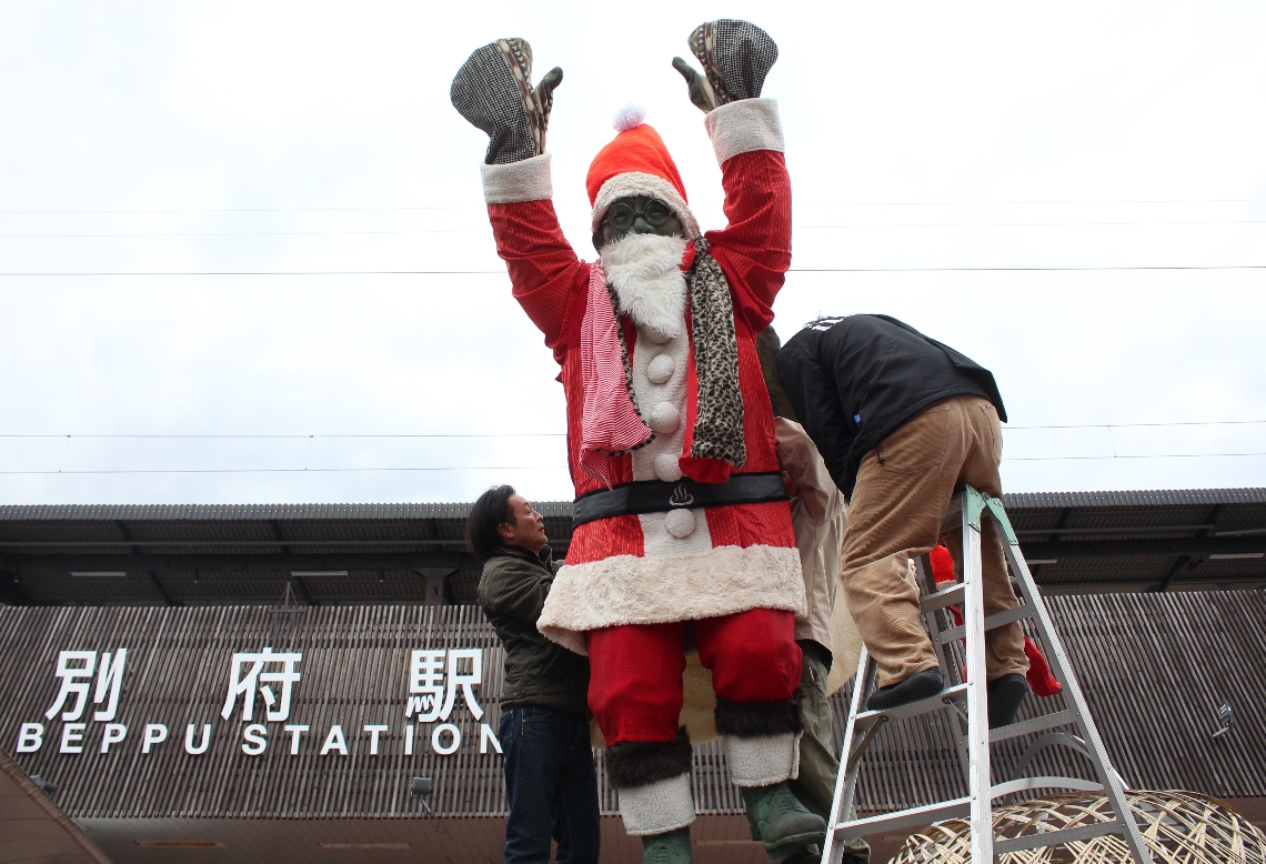 油屋熊八像がクリスマス恒例のサンタに変身JR別府駅東口で25...