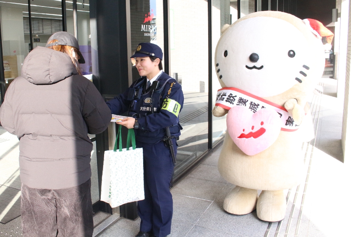 特殊詐欺被害防止へ別府署が啓発活動みらい信金でチラシなど...