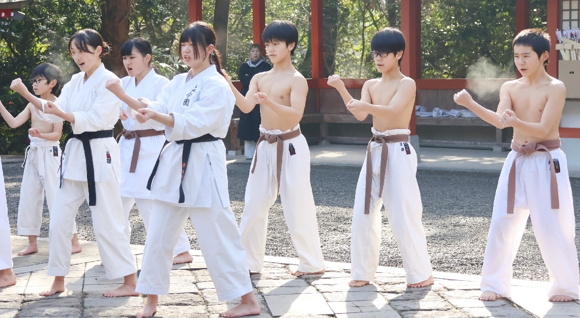 空手道場「日田仁武館」の新春寒稽古大原八幡宮で小中高生10...
