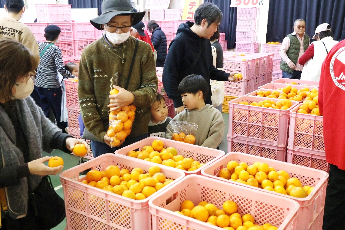 杵築市で農林水産祭ミカン袋詰め放題などにぎわう