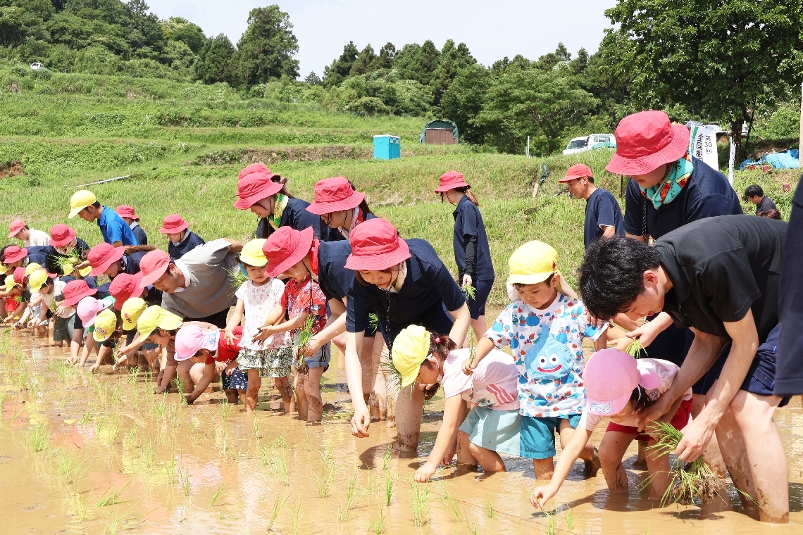 別府市内竈の堂面棚田で園児と児童が田植え体験食育活動の一...