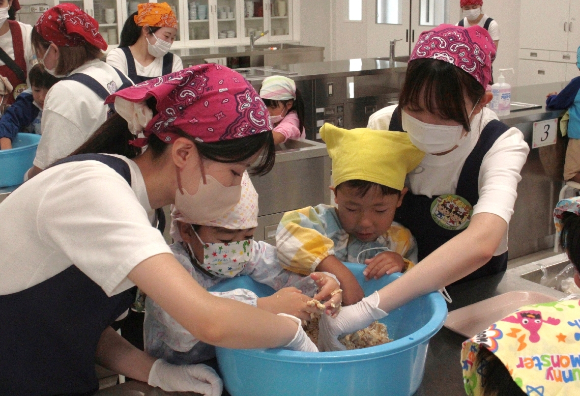別府大付属幼稚園の園児がみそ造りを体験別府大の学生から指...