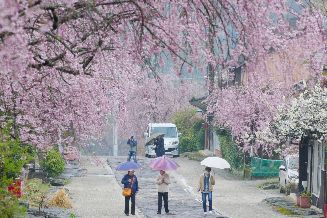 大分市今市に春の色、しだれ桜が満開に庭先や畑に50本「石畳...