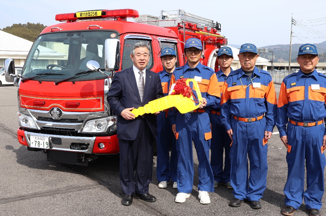 九重町南山田地域管轄の消防団がポンプ車更新水槽搭載、4輪...
