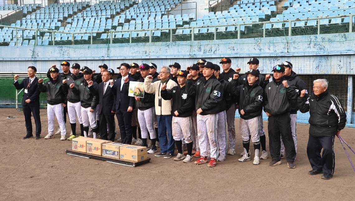 津久見市で合宿中、韓国の新成大野球部を激励市長ら地元産ミ...