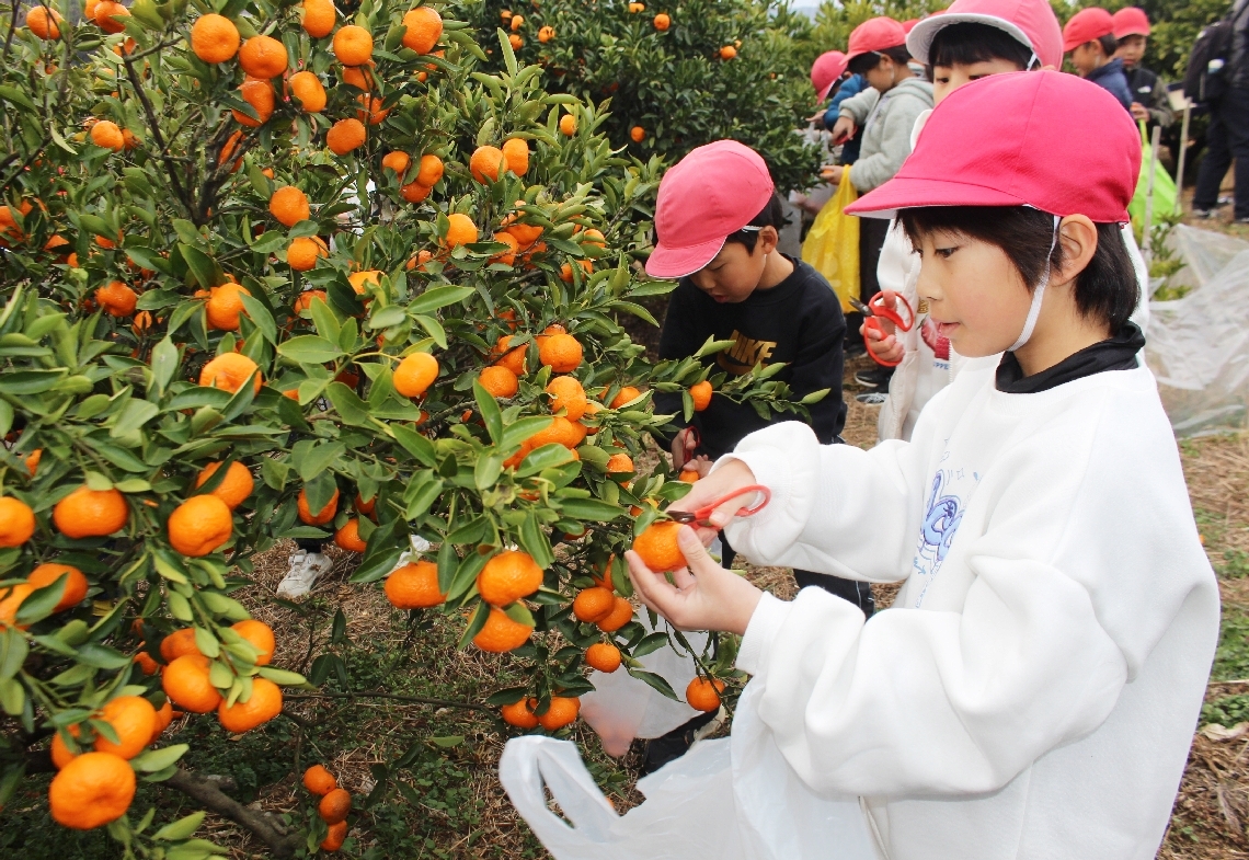 津久見市で児童が「尾崎小ミカン先祖木」の収穫体験袋いっぱ...