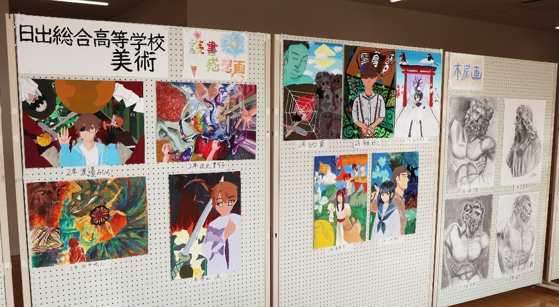 日出支援学校と日出総合高の共同作品展ビーズストラップや絵...