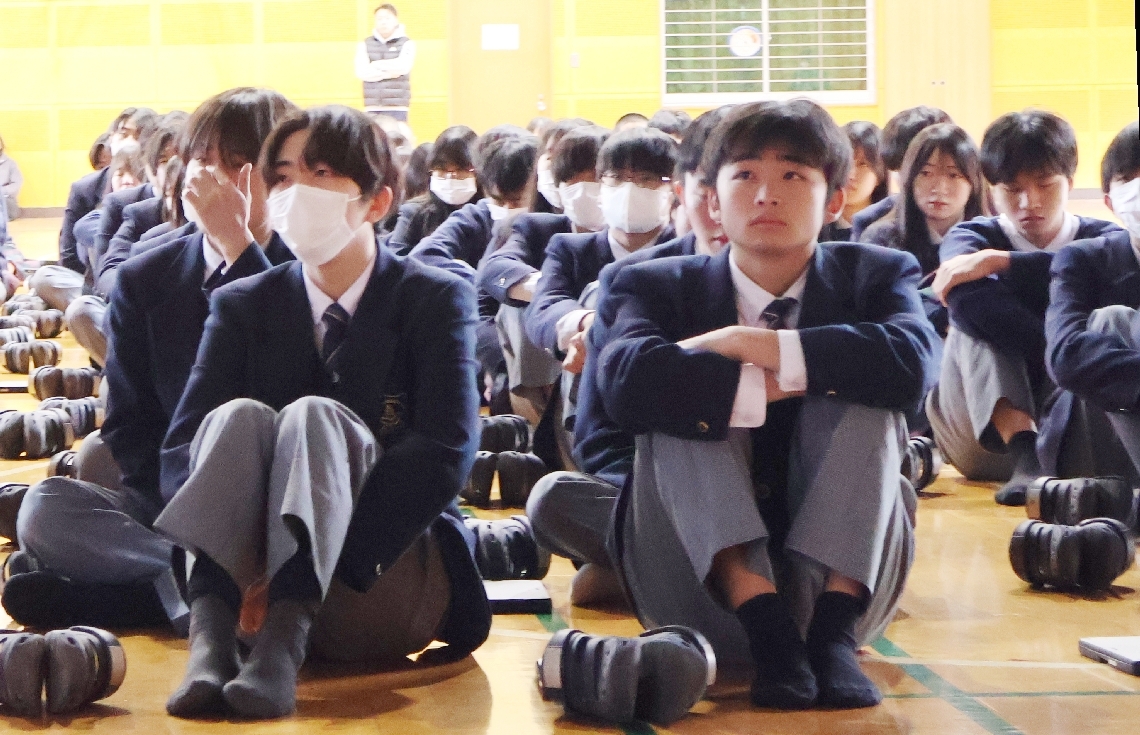 「自転車の青切符に理解を」情報科学高で講話県の担当者が左...