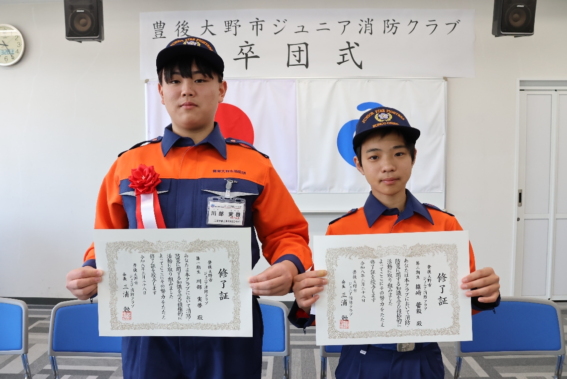 豊後大野市ジュニア消防クラブ、川部さんと篠崎さんが卒団「...