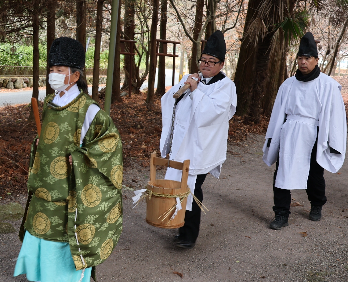 由布市の霧島神社などで伝統の甘酒祭りおけを担いで地域を巡...