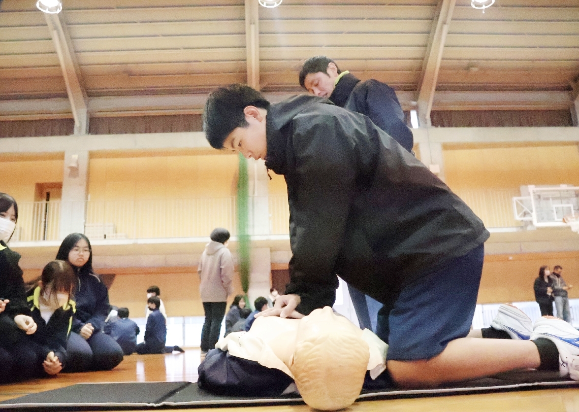 臼杵市の野津中生徒が救命入門コース受講PTA主催、AEDの使い...