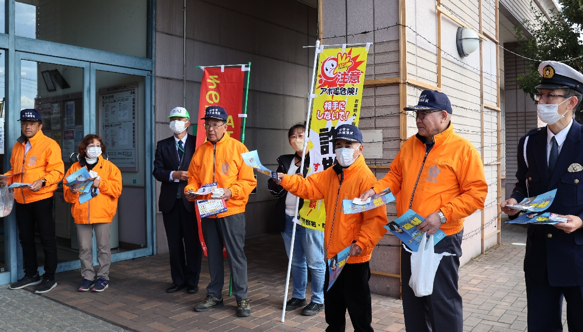 由布市で特殊詐欺防止の啓発活動少年補導員らがチラシなど配...