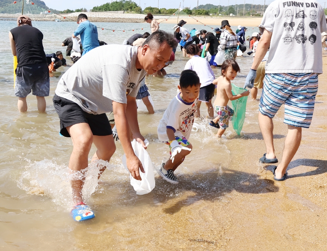 姫島海水浴場でクルマエビや魚のつかみ取り大会水しぶき上げ...