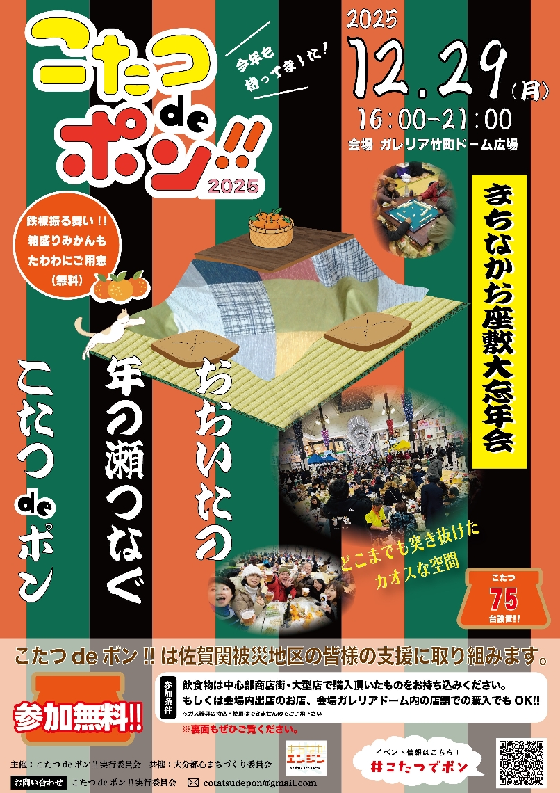 大分市中央町で29日「お座敷大忘年会」こたつ75台を並べて、...