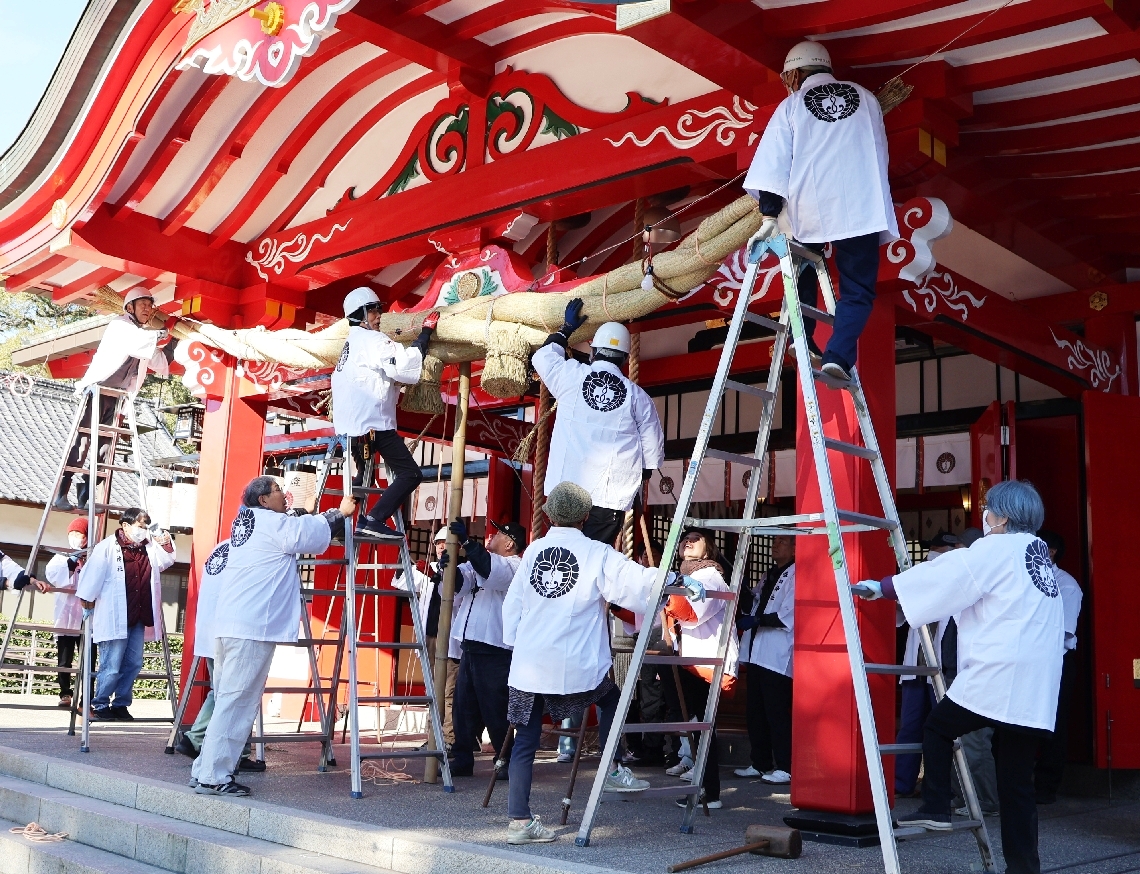 大分市の春日神社で本殿の大しめ縄張り替え「健康で平和に暮...
