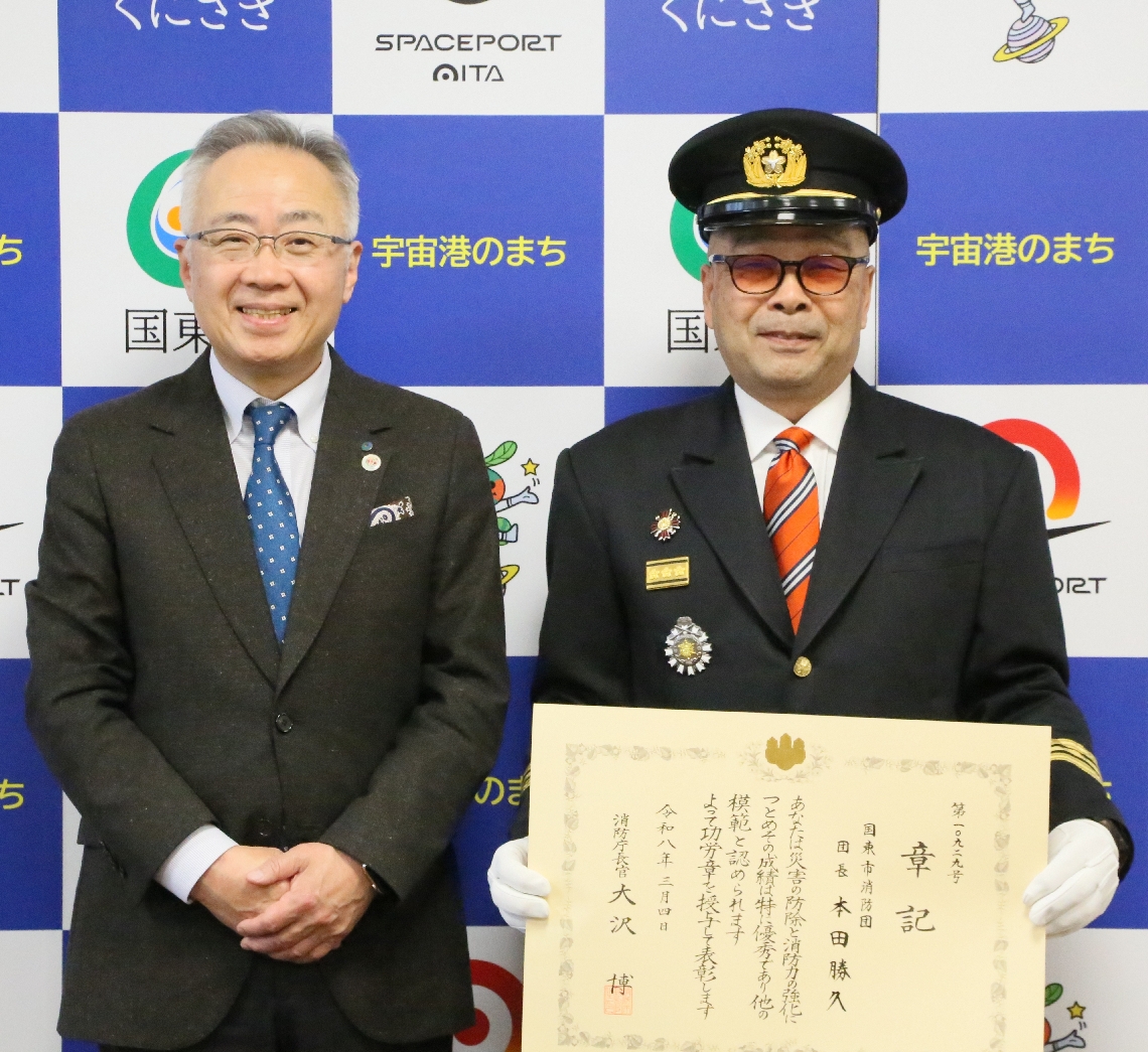国東市消防団の本田団長、長官表彰功労章を市長に報告「家族...