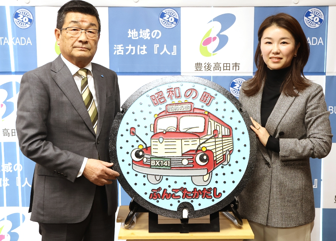 ボンネットバス「昭和ロマン号」のマンホール完成豊後高田市...