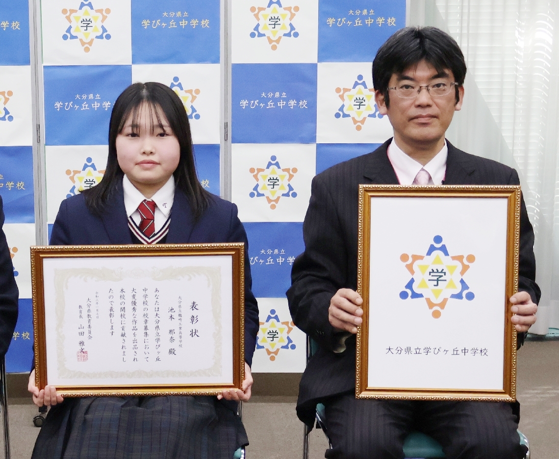 【動画】学びヶ丘中の校章をデザイン、鶴崎工業高3年の池本...