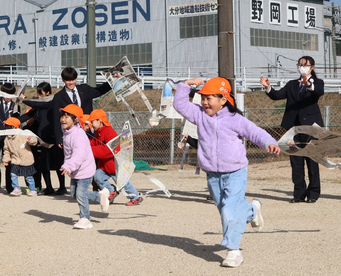 日本文理大付高生徒と園児がたこ揚げで交流新聞で製作「触れ...