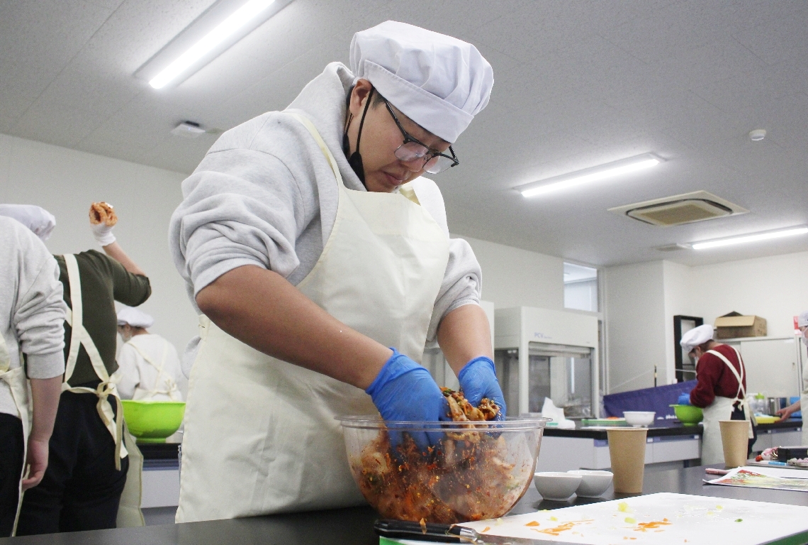 別府大で漬物製造について学ぶ講義調味液を白菜と混ぜ、オリ...
