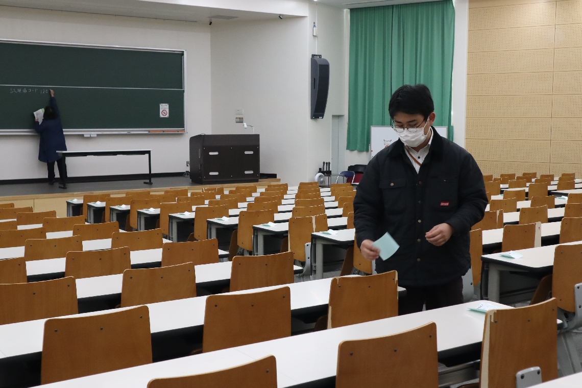 大分県内の大学で入学共通テストの会場設営受験番号票貼り試...