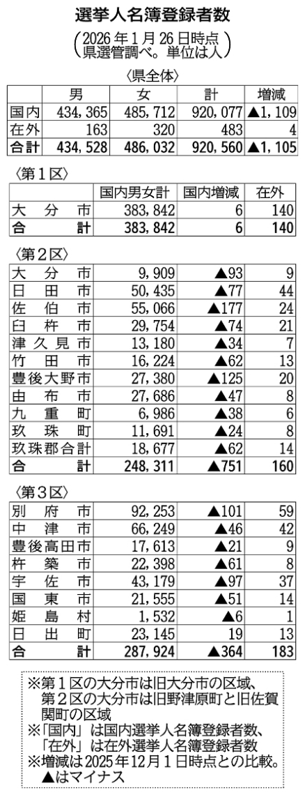 大分県内の有権者数92万560人前回発表より1105人減
