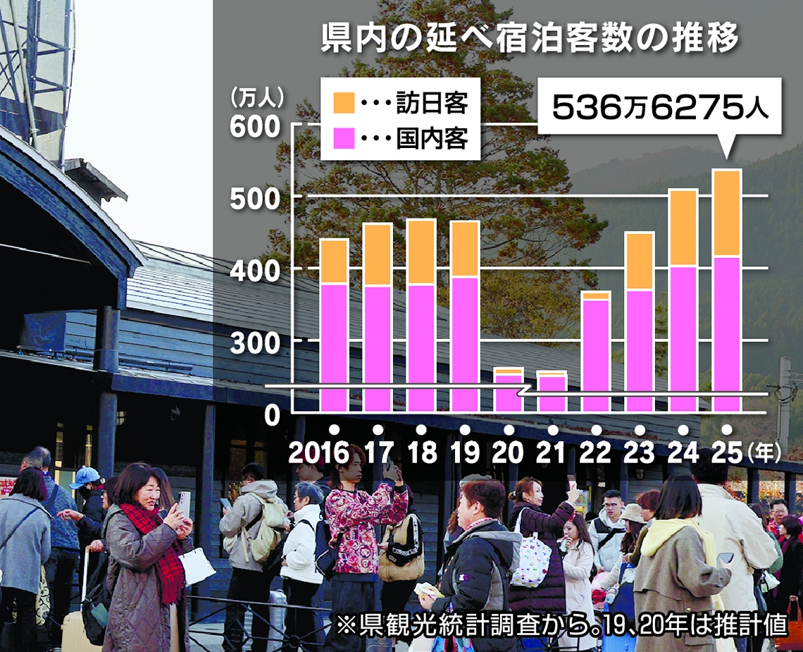大分県内25年の宿泊者数、最多更新536万6275人訪日客は12.7...