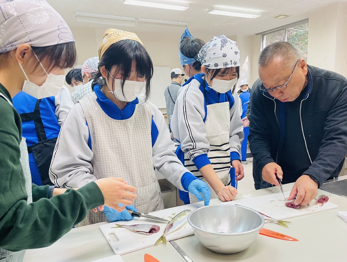 佐伯市東雲中で魚料理教室生徒がアジの三枚おろしなどに挑戦
