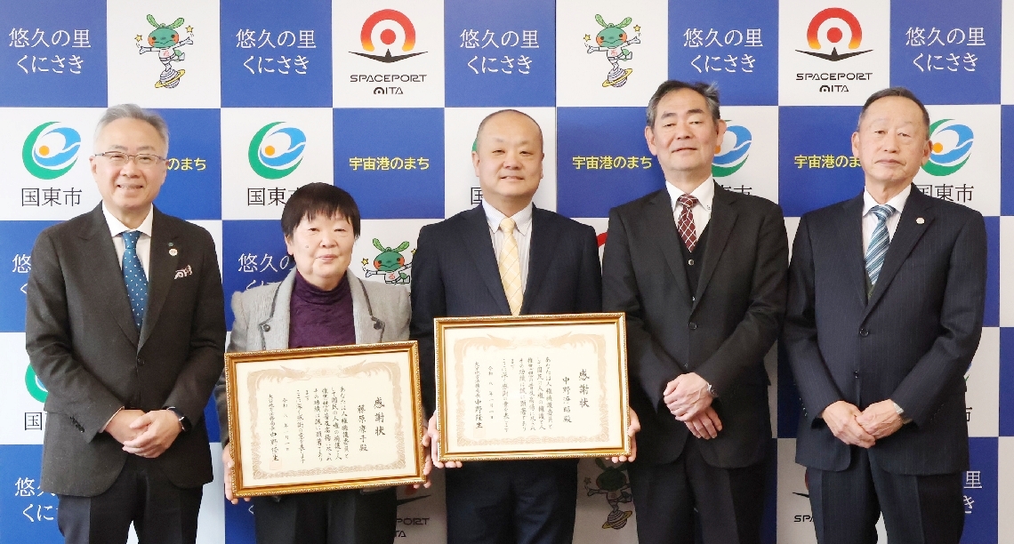 豊洋精工の清原社長が地域社会貢献者賞受賞国東市長に報告