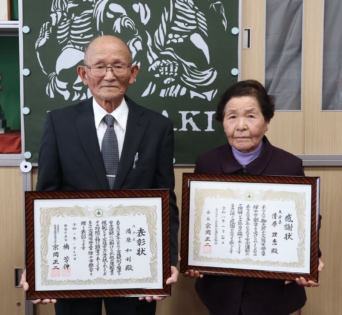 国東市の清原さんに交通栄誉章緑十字銀章長年にわたり無事故...