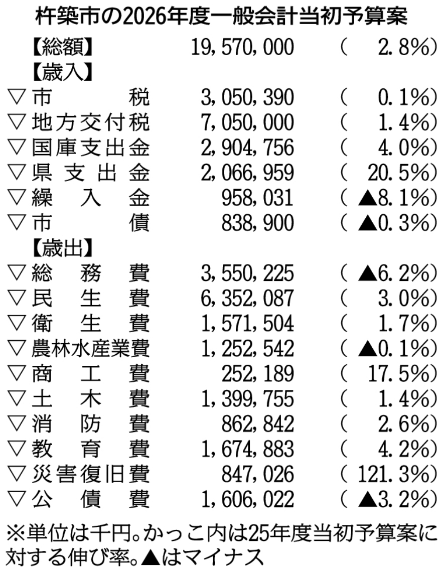杵築市の26年度当初予算案、2.8%増の195億7千万円