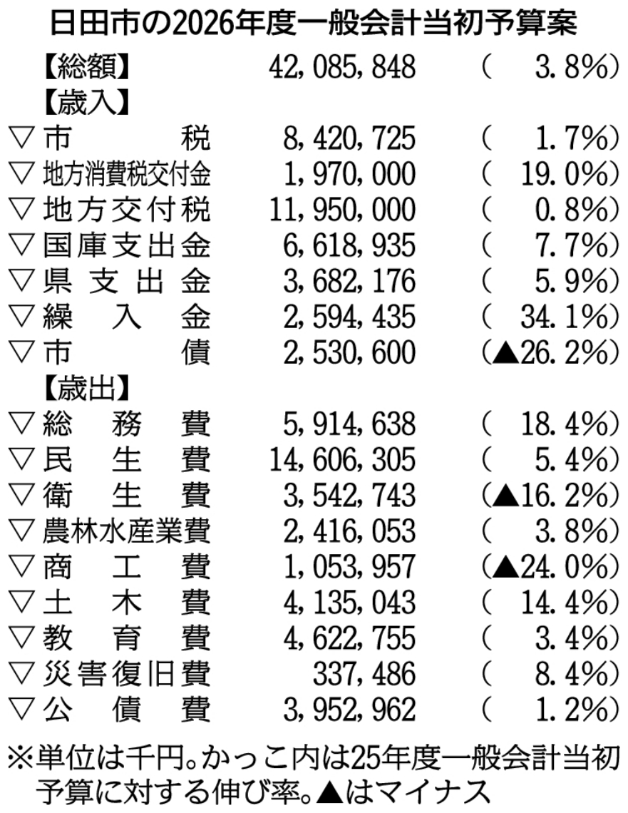 日田市の26年度当初予算案3.8%増の420億8584万8千円過去最...
