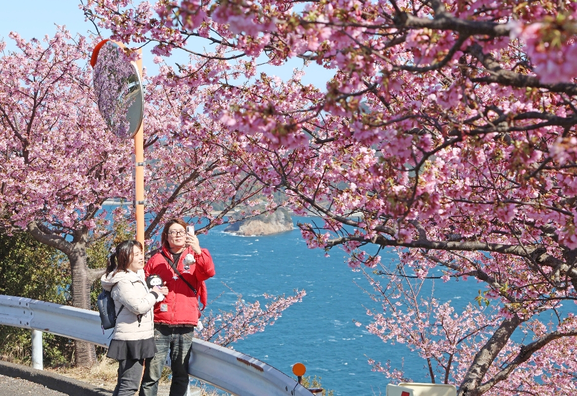 青い海と空、桃色の河津桜きょう二十四節気「雨水」