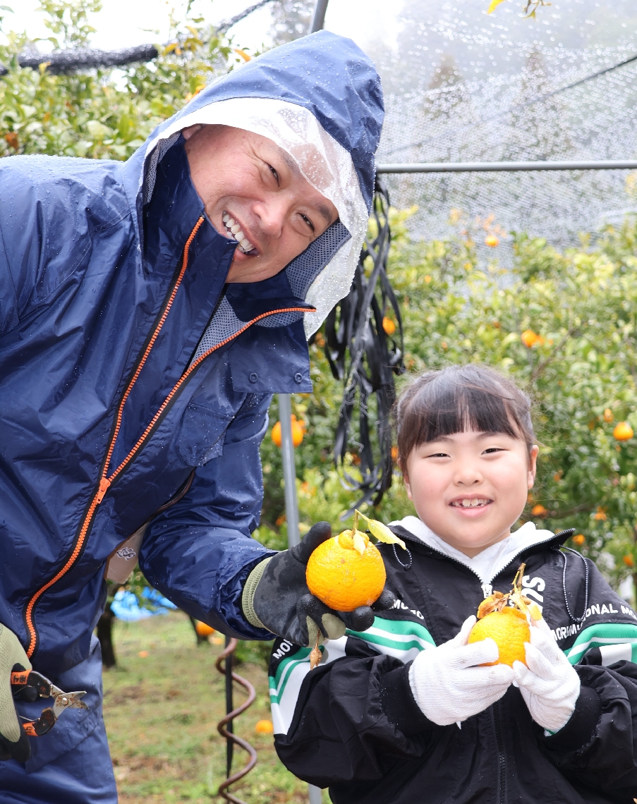 佐伯市西上浦でミカンオーナーが収穫作業家族連れが笑顔で摘...