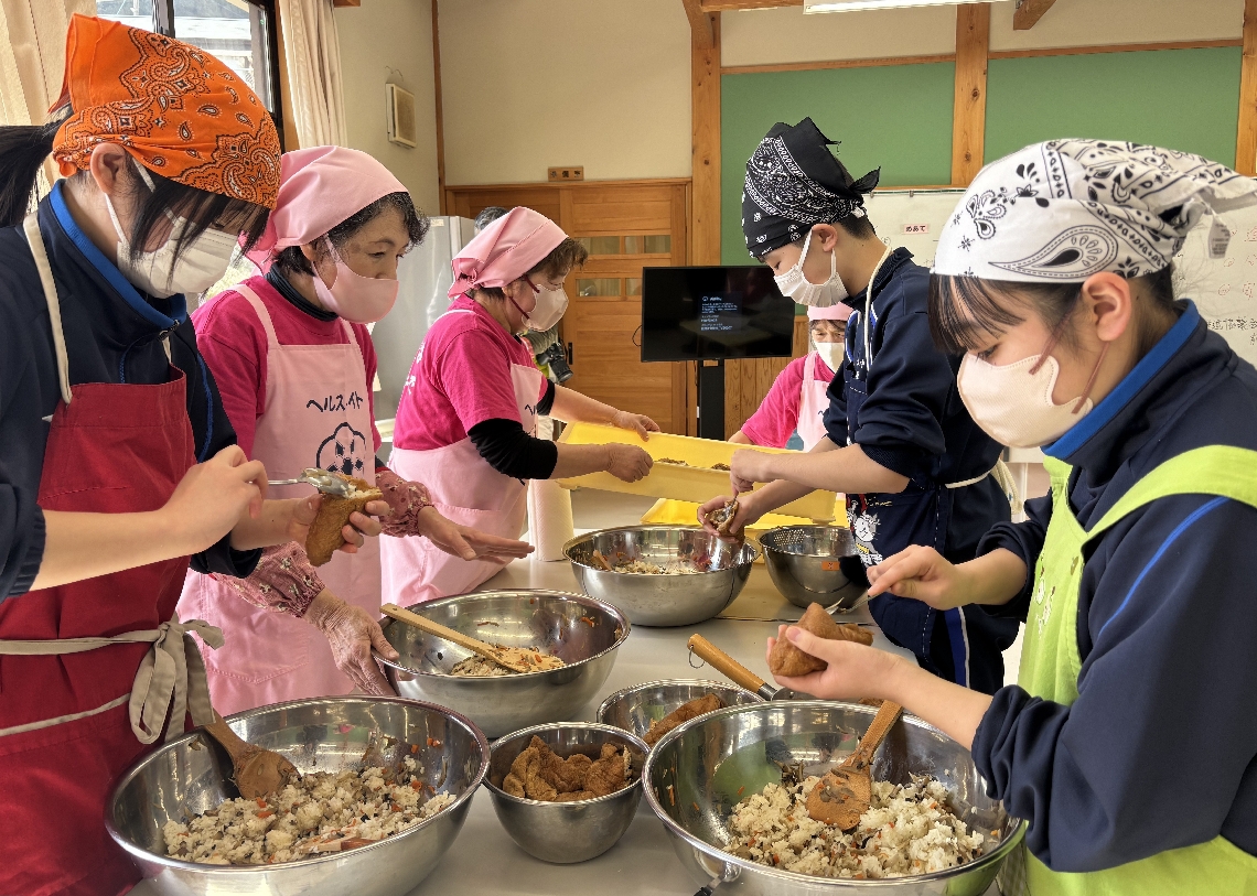 日田市前津江中で郷土料理学習生徒が頭巾の形の「とっきん寿...