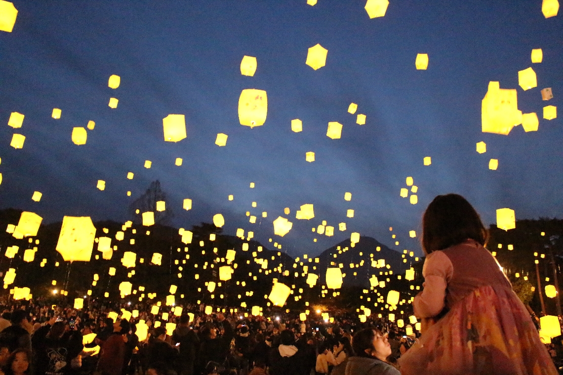 幻想的な世界、ランタン750個が一斉に夜空へ別府公園でイベ...