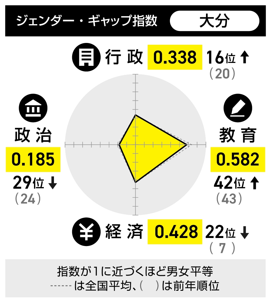 ジェンダー・ギャップ指数、大分県が行政分野で全国16位教育...