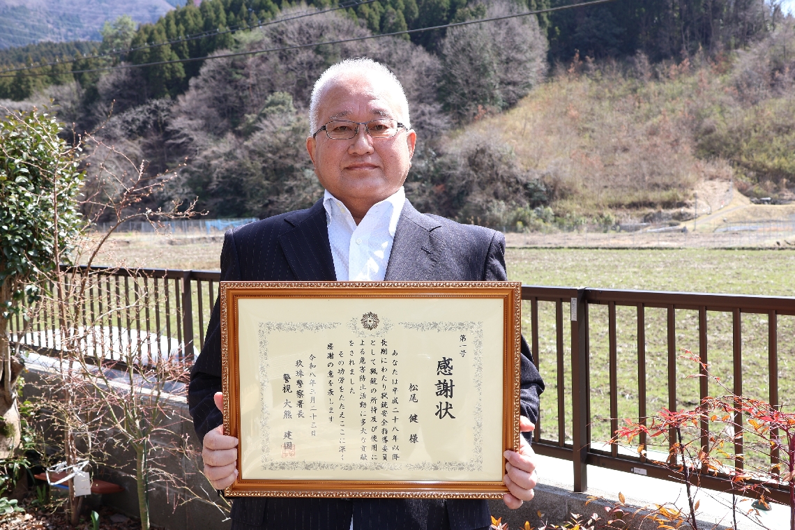 猟銃安全指導委員の松尾さんに玖珠署が感謝状活動10年「引き...