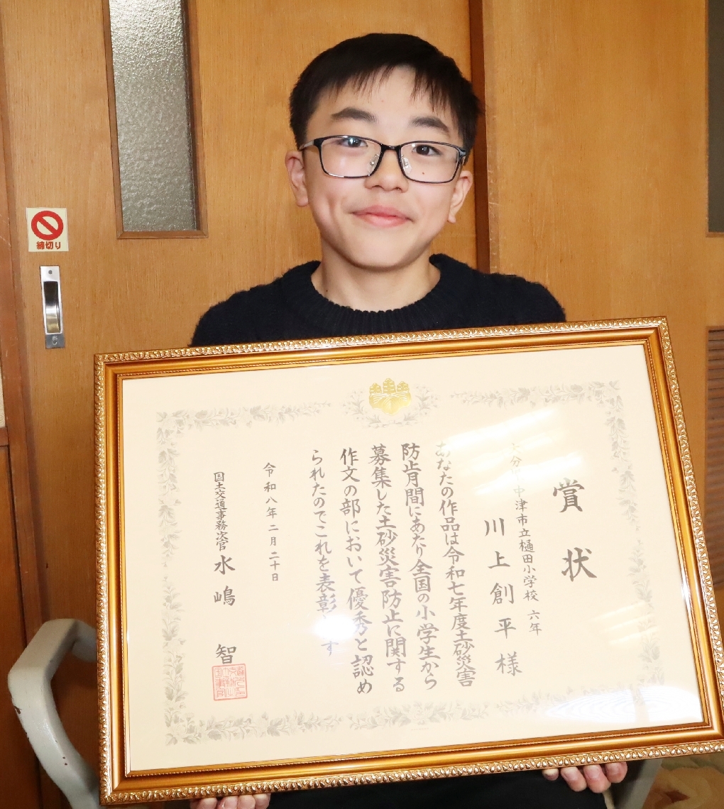 中津市の川上さん、国交省の土砂災害防止作文で優秀賞「防災...