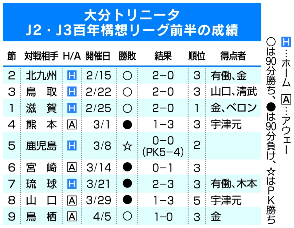 トリニータ、浮き沈みがあった百年構想リーグ前半戦主力と控...