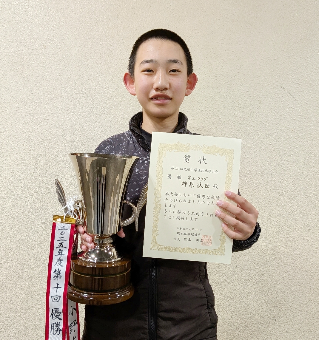 九州中学選抜卓球、男子個人シングルスで宇土クの神原2連覇...